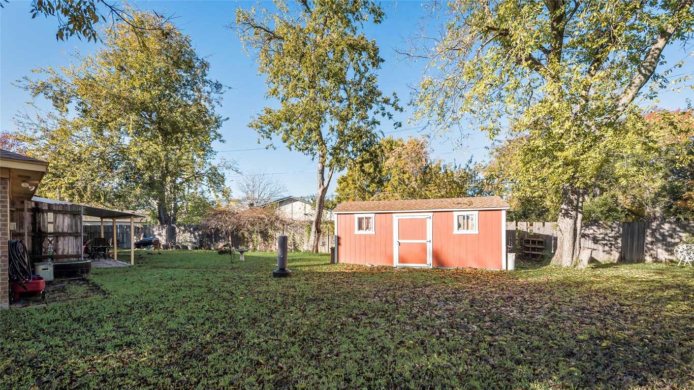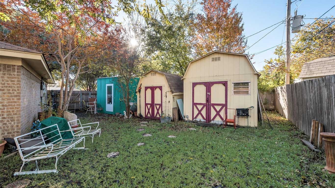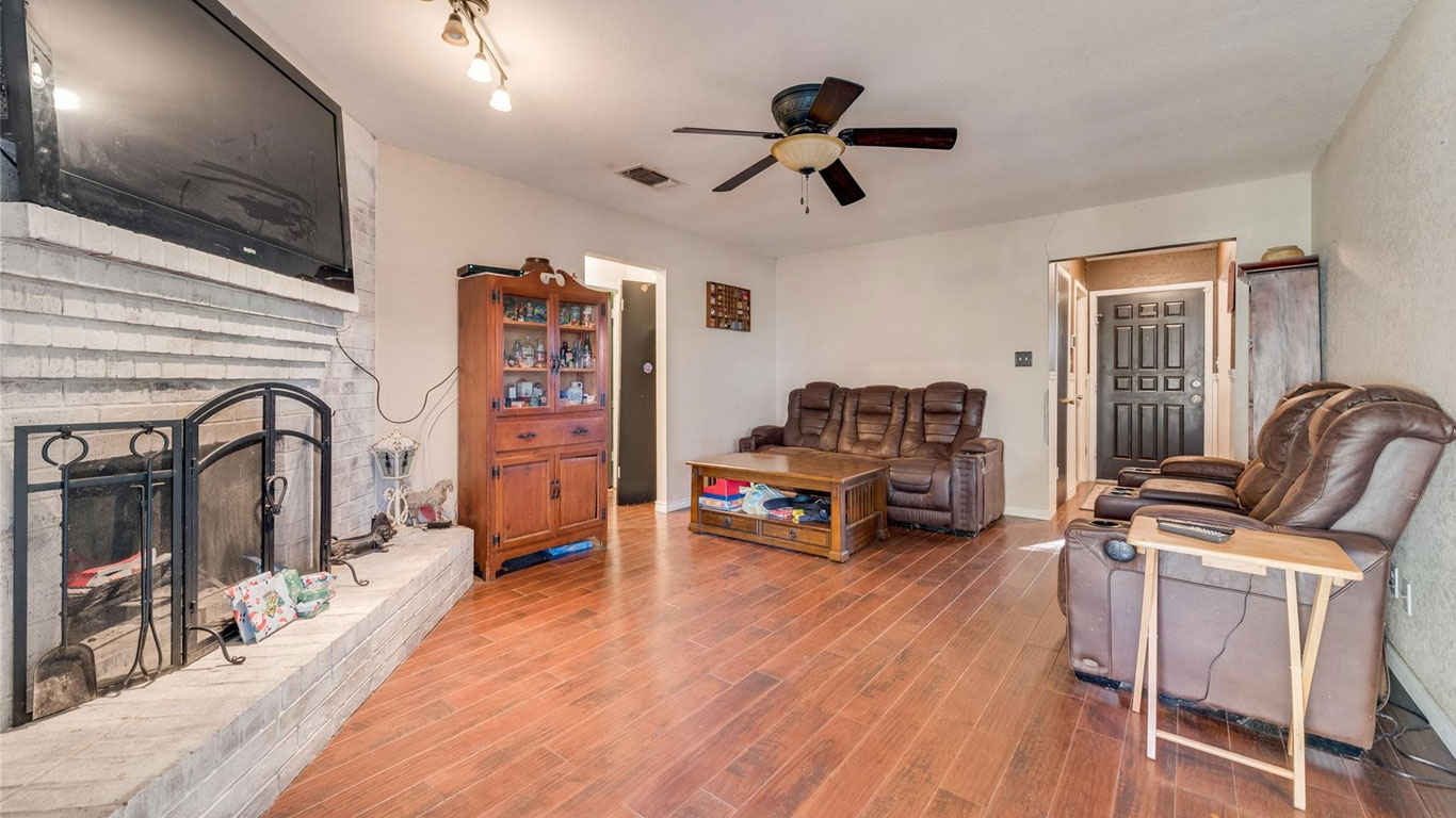 This Benbrook brick home on a quiet cul-de-sac features wood floors, a cozy fireplace, breakfast nook, spacious primary suite with dual sinks and walk-in closet, plus multiple storage buildings with electricity and a lifetime transferable warranty.