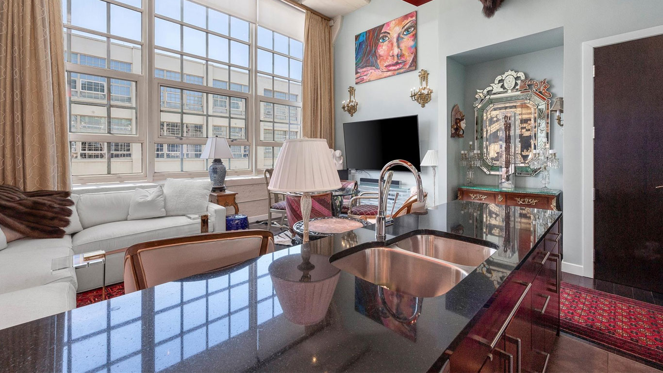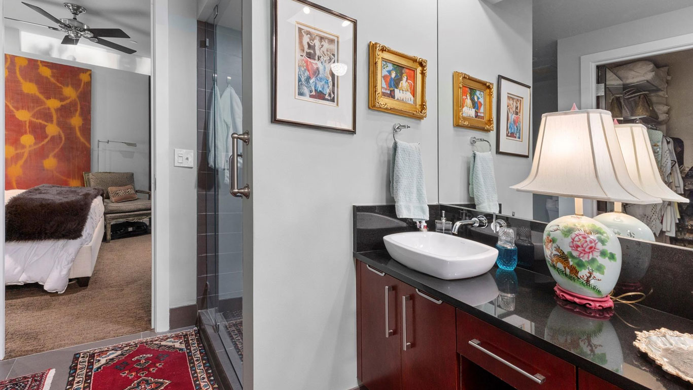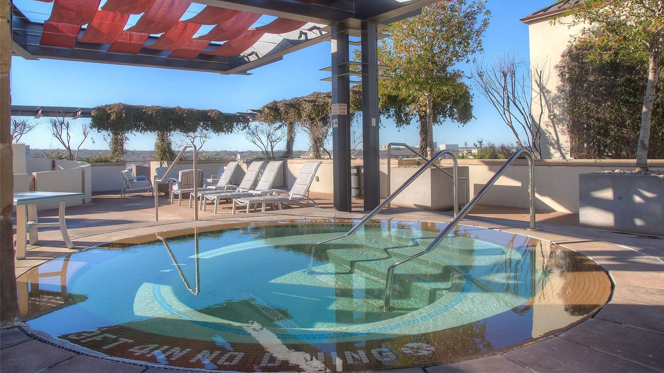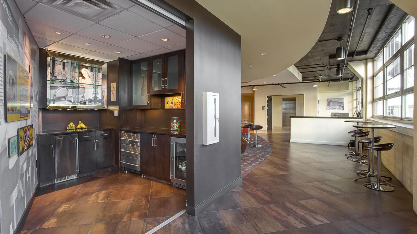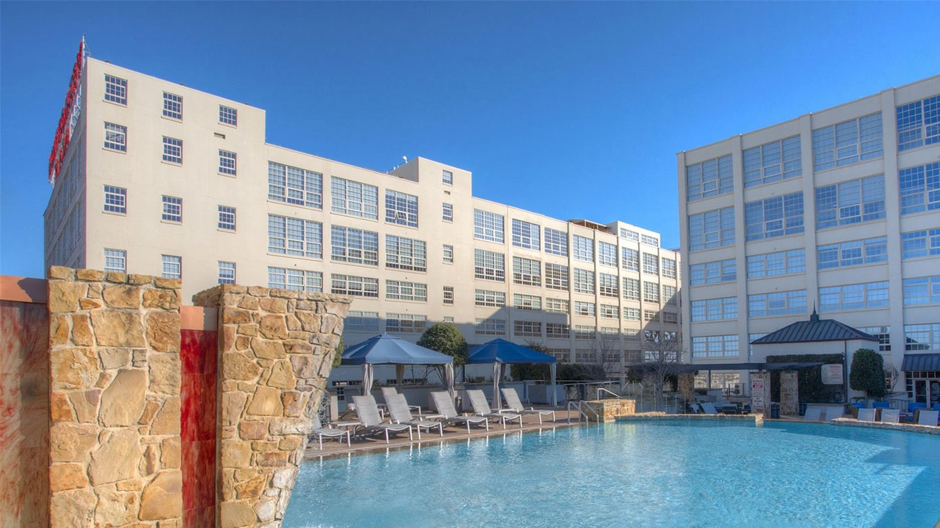 Modern West 7th condo with 16-ft ceilings, pool views, premium kitchen, spa-like primary bath, two bedrooms, and full access to Montgomery Plaza’s resort-style amenities.