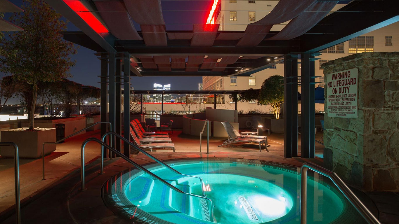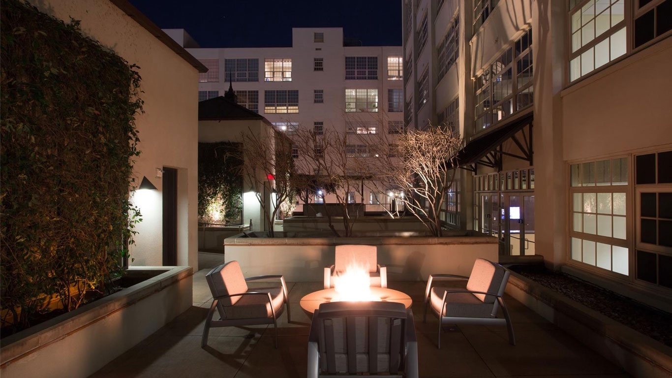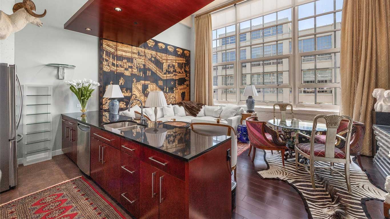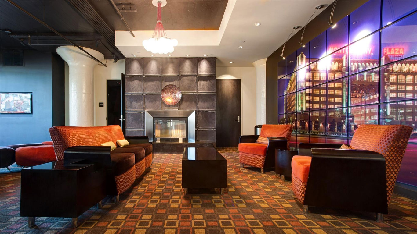 Modern West 7th condo with 16-ft ceilings, pool views, premium kitchen, spa-like primary bath, two bedrooms, and full access to Montgomery Plaza’s resort-style amenities.