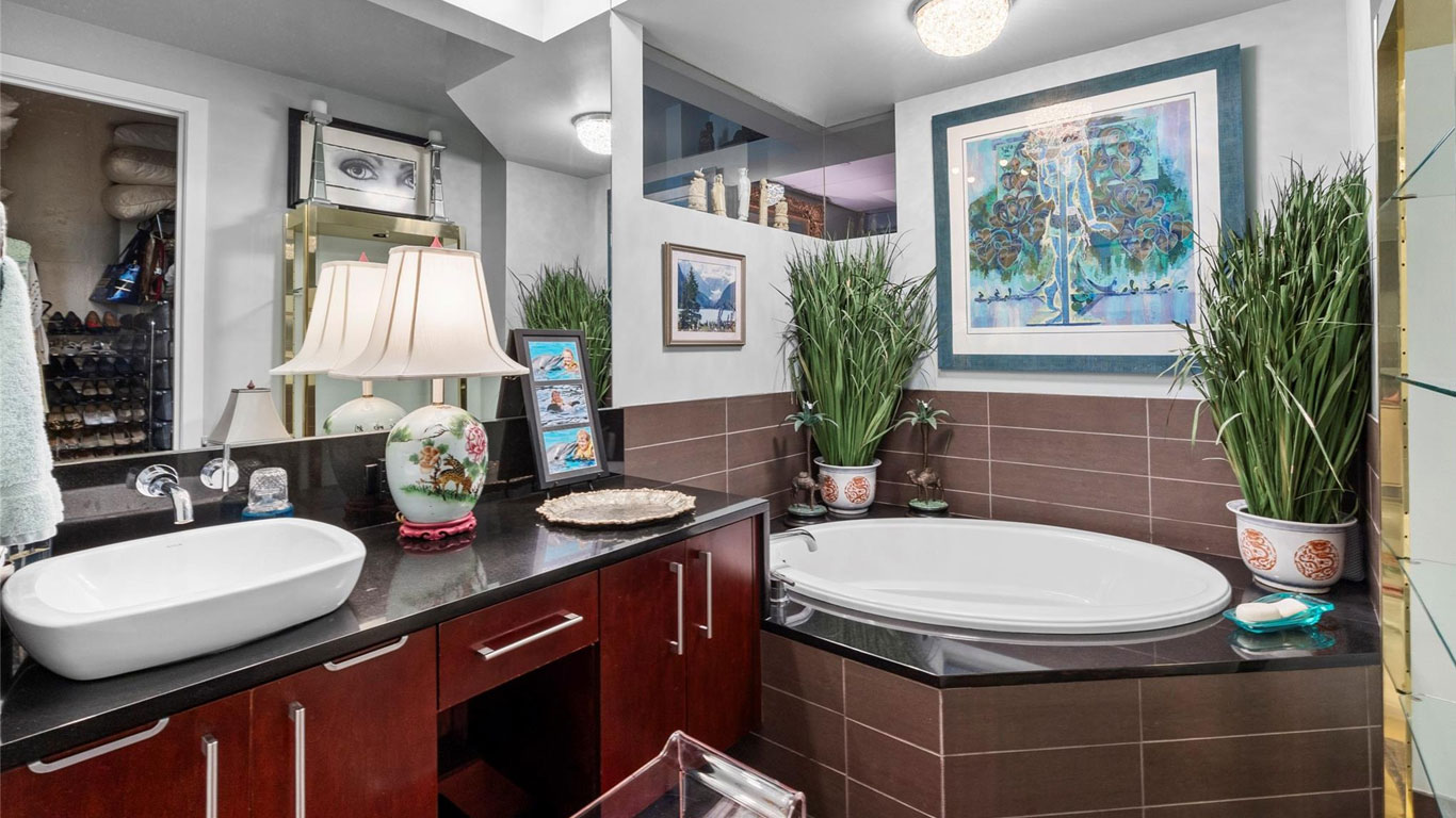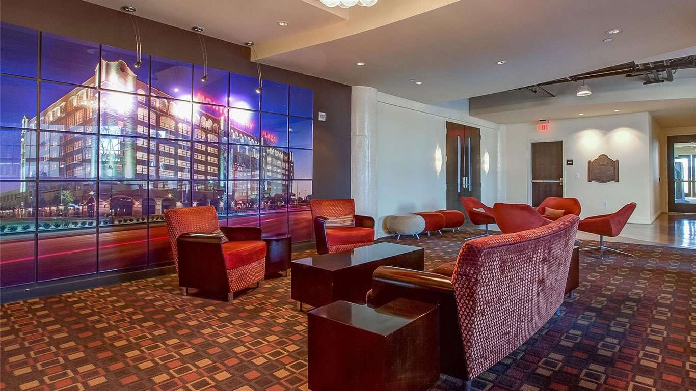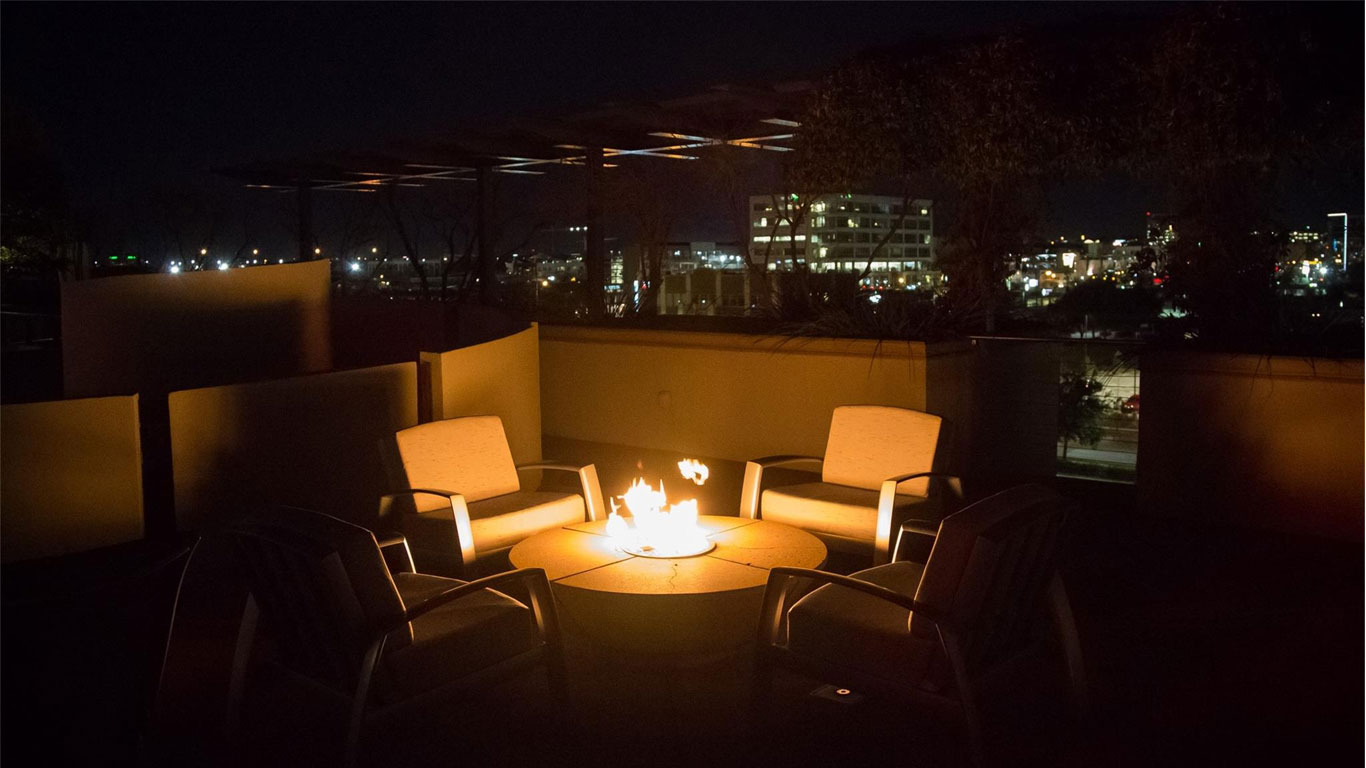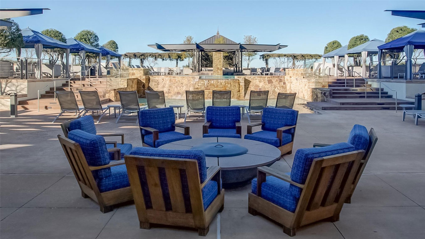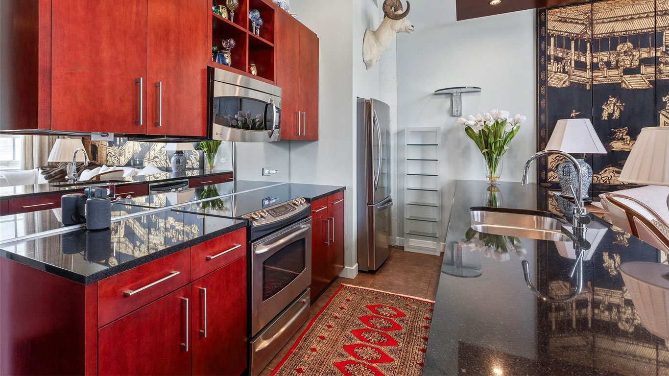 Modern West 7th condo with 16-ft ceilings, pool views, premium kitchen, spa-like primary bath, two bedrooms, and full access to Montgomery Plaza’s resort-style amenities.