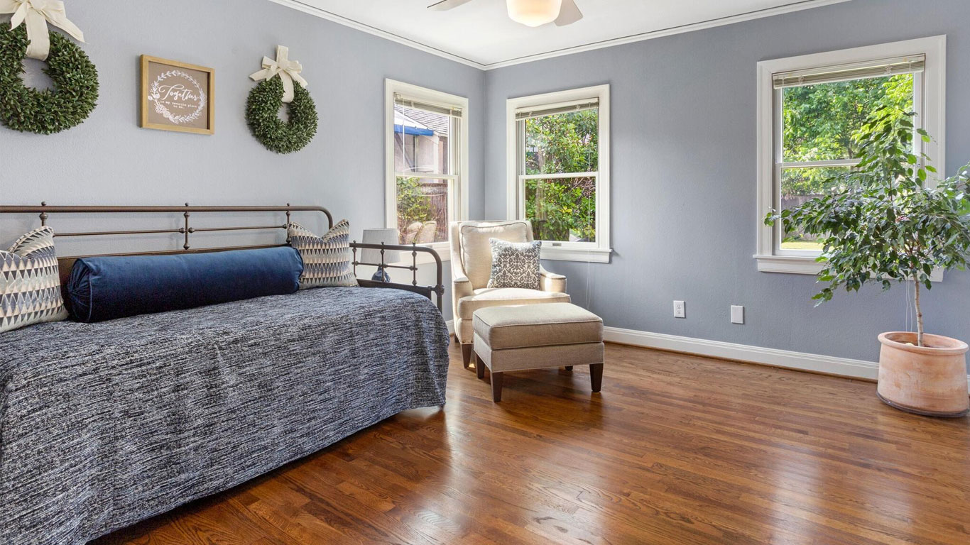 Full of vintage charm, this 3 bedroom, 3 full bath and 1 flex room home is perfect for so many different phases of life. Beautiful hardwood floors, natural light, wood-burning fireplace, arched doorways, inviting front porch, and backyard garden come together to complete this classic home. Located on a quiet street yet close enough to walk to TCU! Features not to be missed, new roof, 2021 HVAC, Anderson windows, Perennial flower beds, sprinkler system, flagstone walkway, and electric gate.