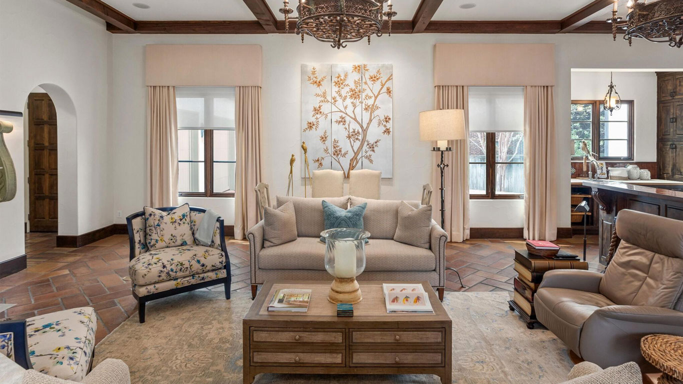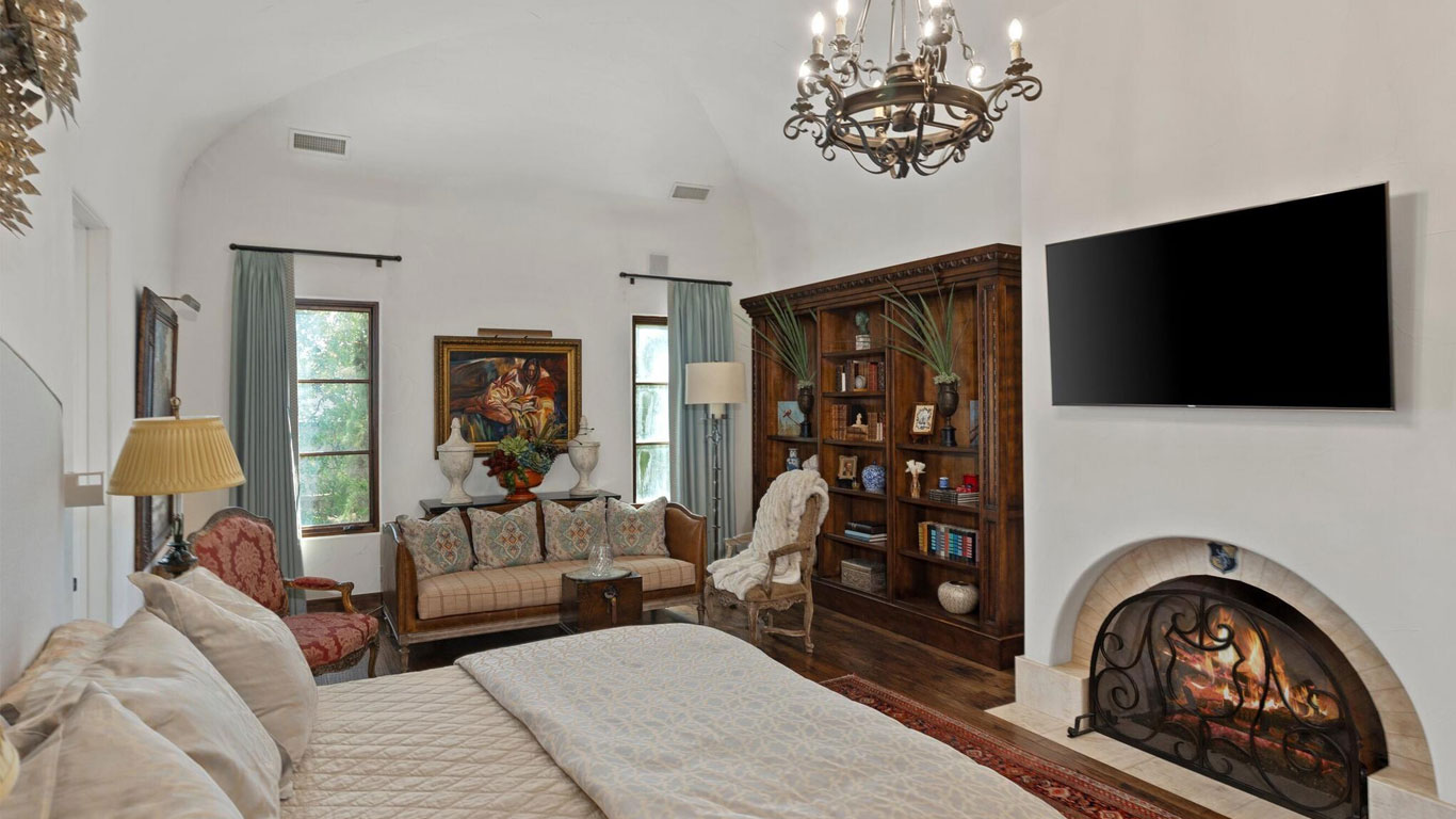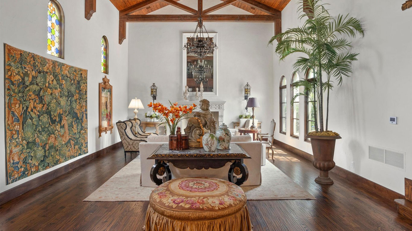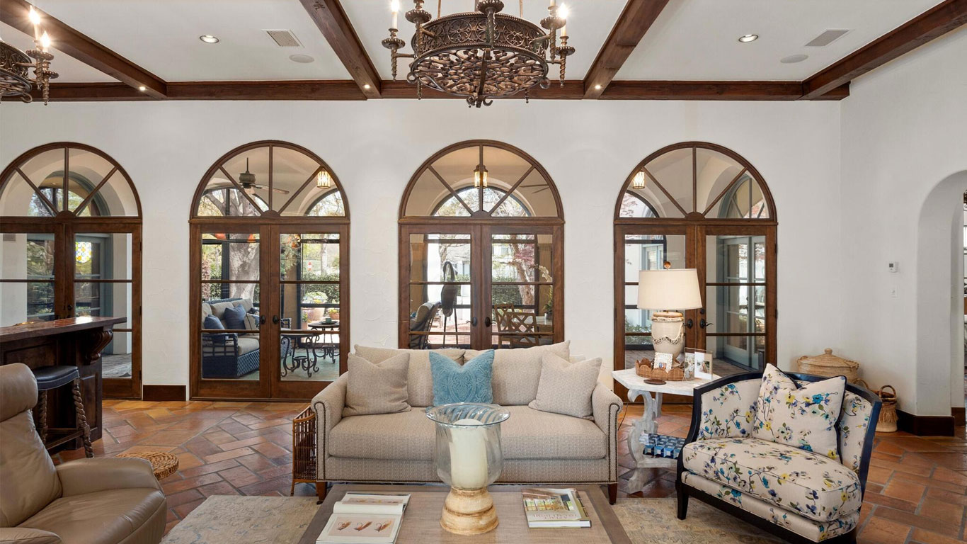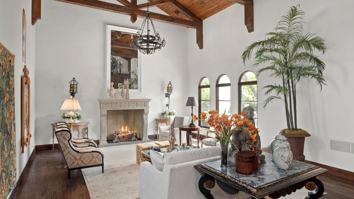 This elegant Spanish-style Westside home features 4 bedrooms, 4.5 baths, an open layout with tall wood-detailed ceilings, high-end finishes, and a sunroom overlooking a serene garden patio with a stucco fireplace.