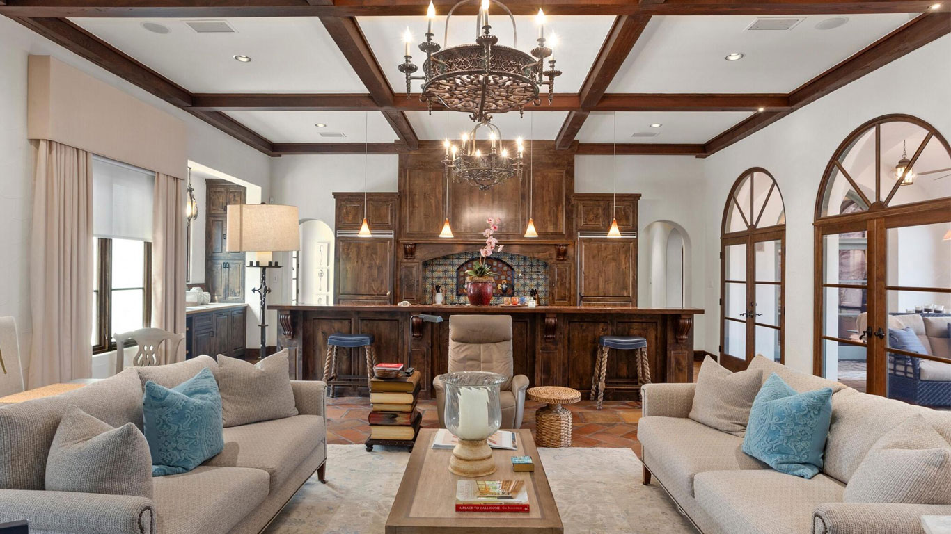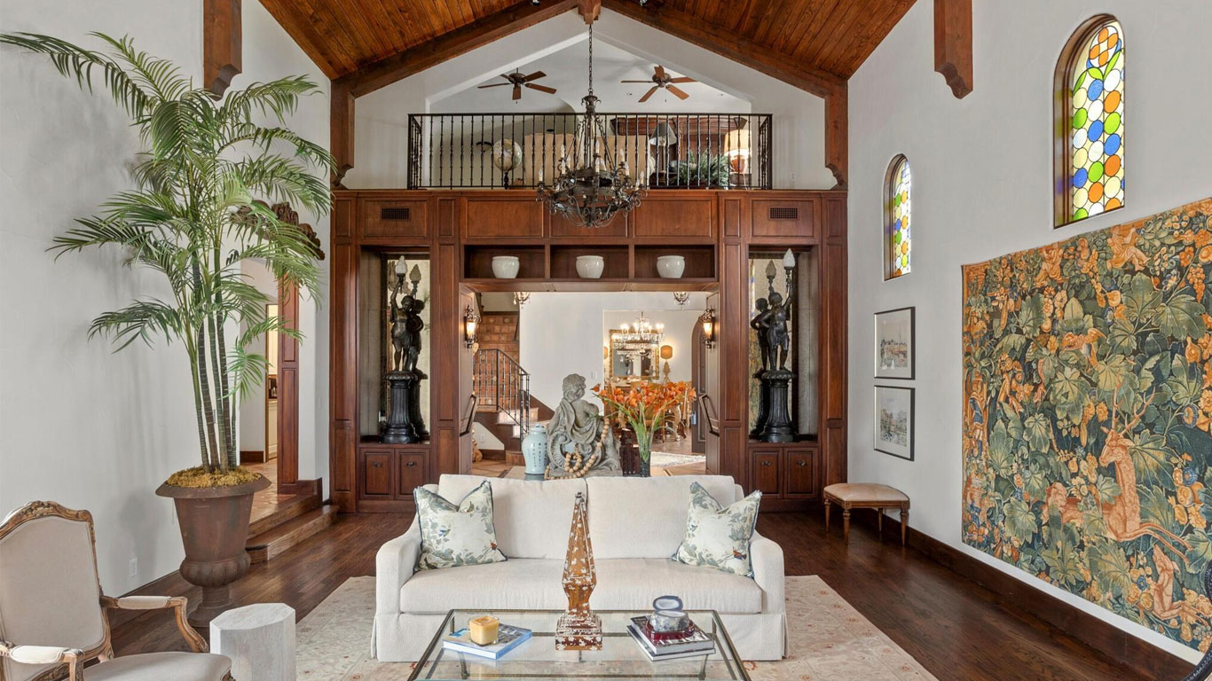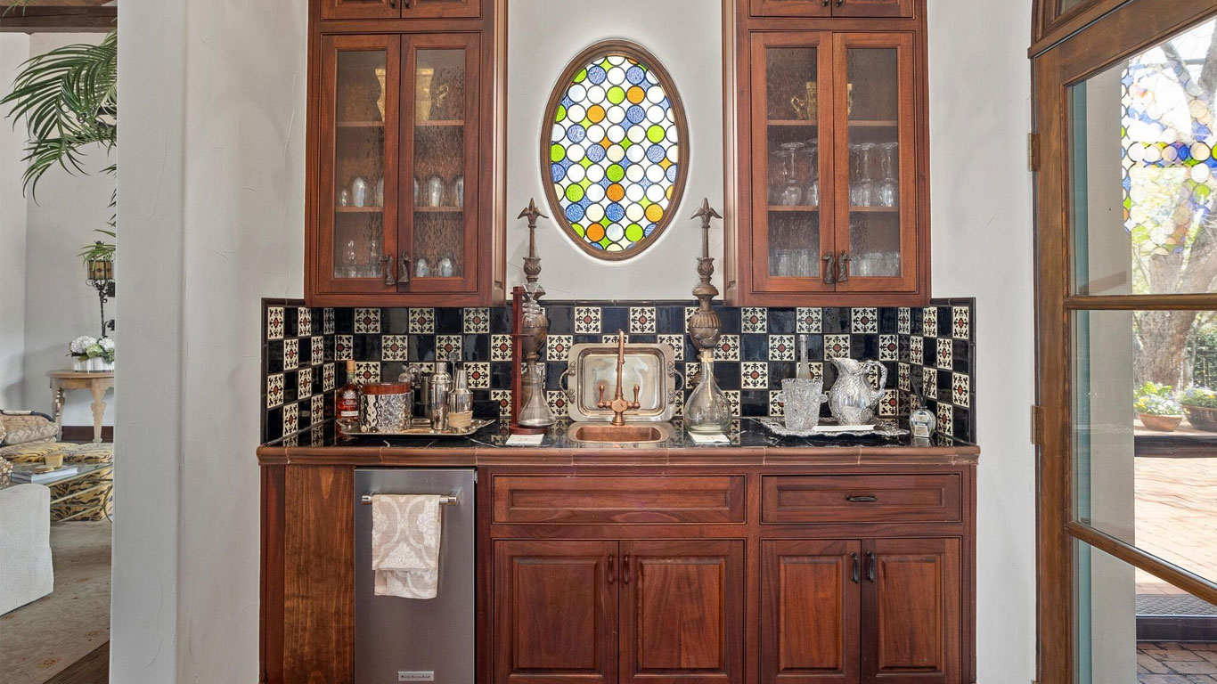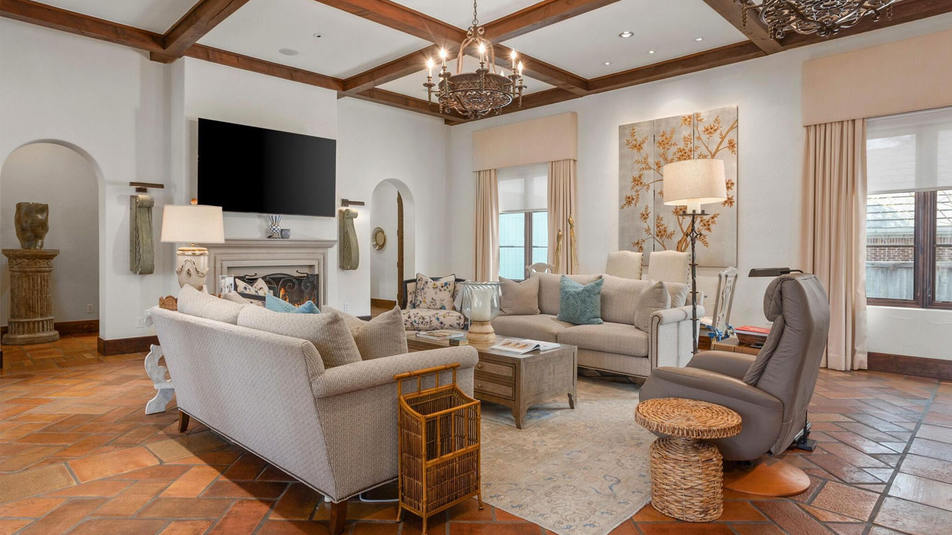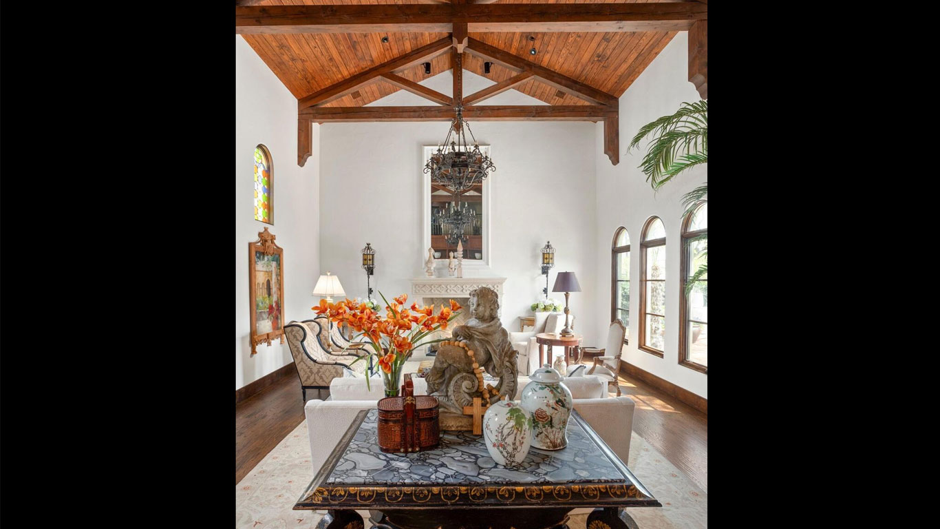 This elegant Spanish-style Westside home features 4 bedrooms, 4.5 baths, an open layout with tall wood-detailed ceilings, high-end finishes, and a sunroom overlooking a serene garden patio with a stucco fireplace.