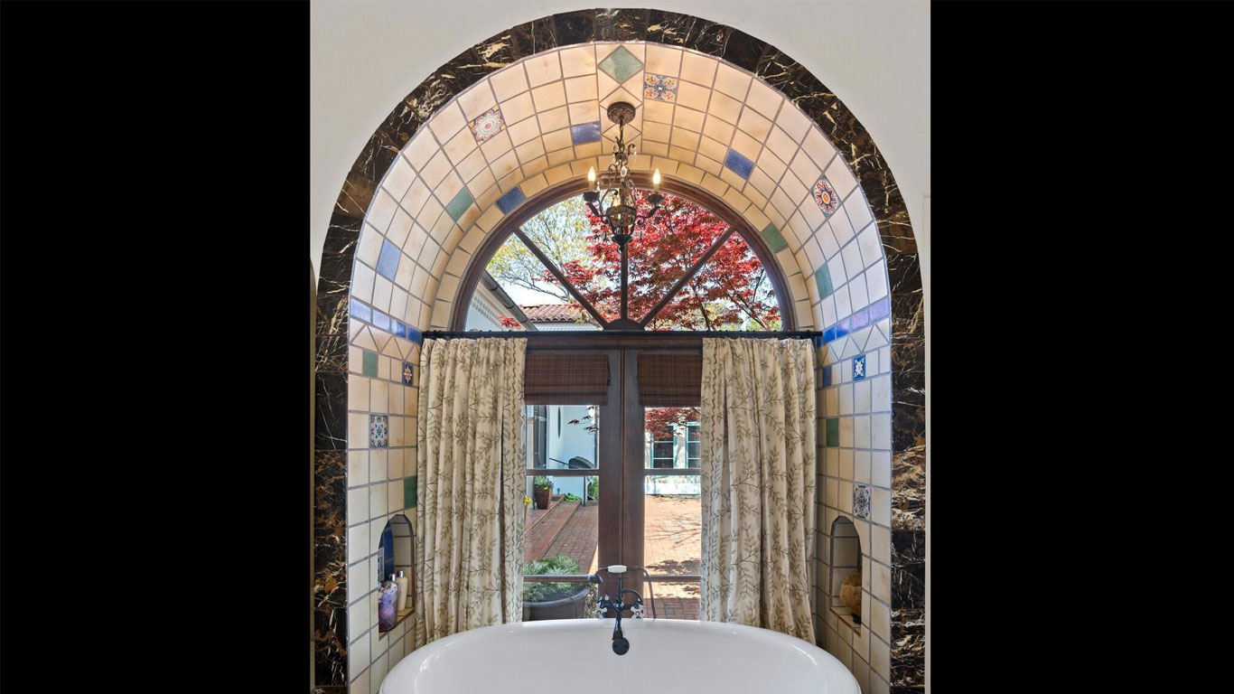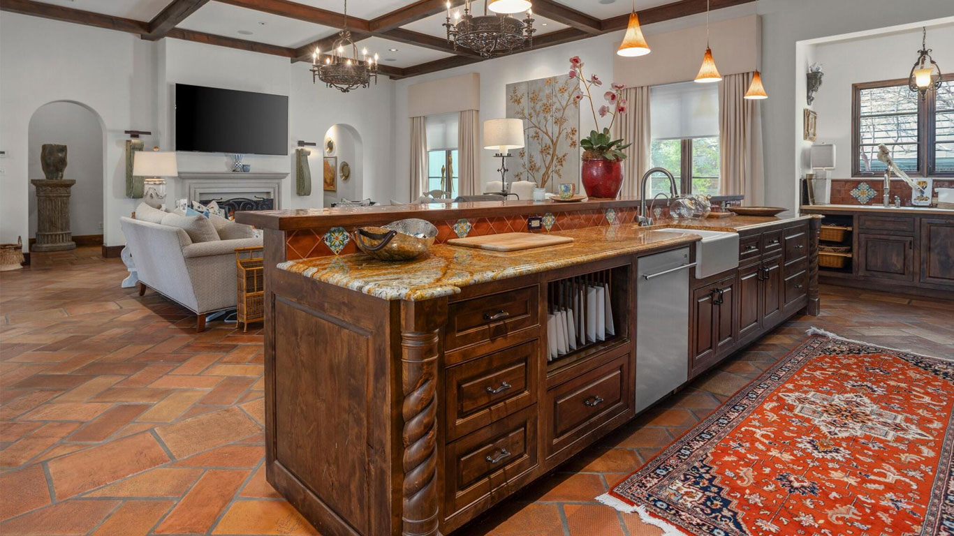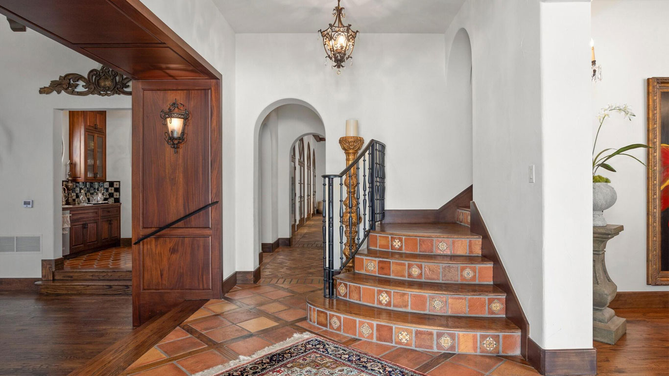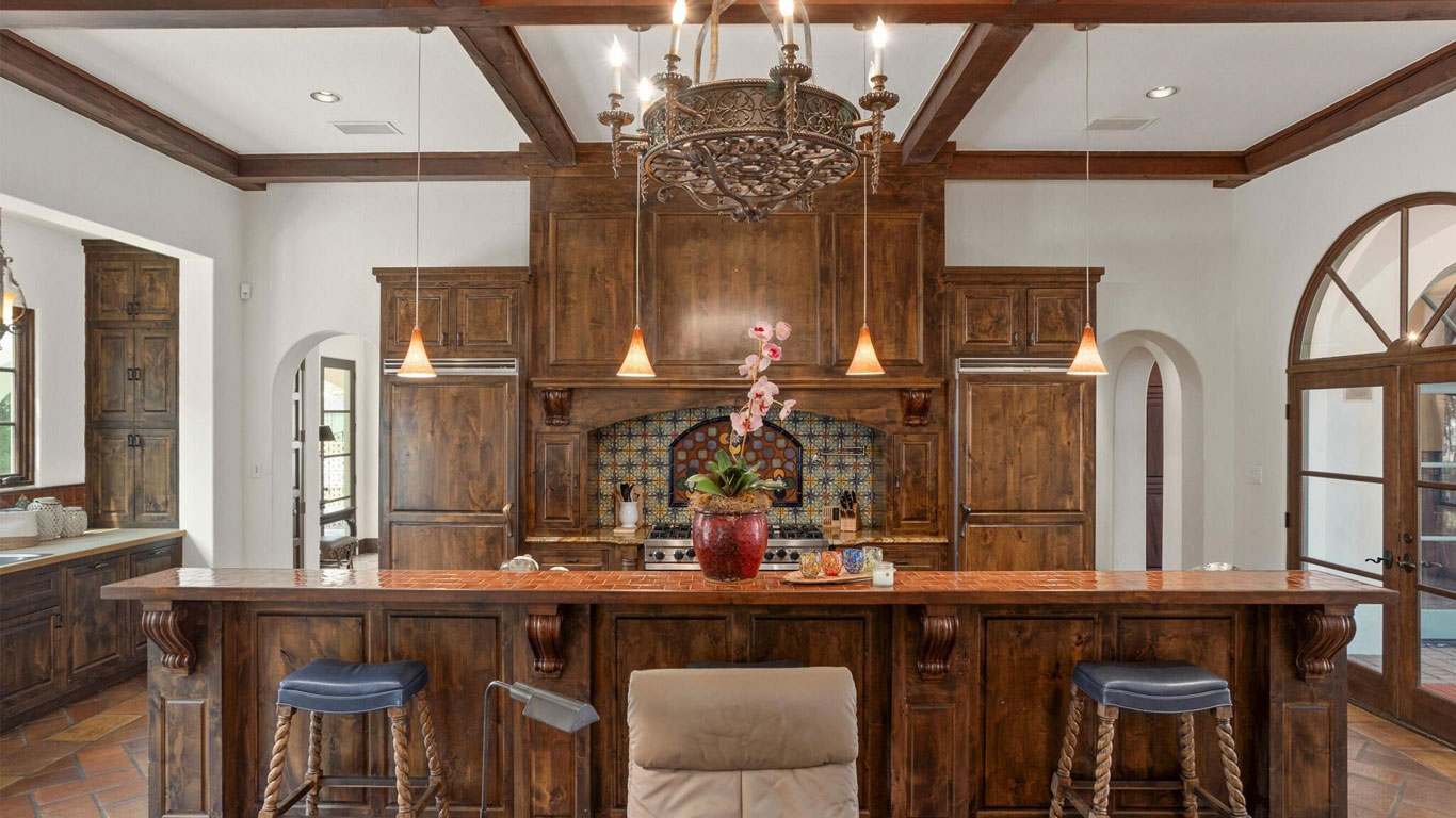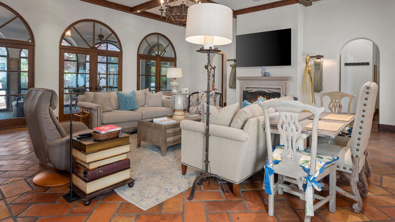 This elegant Spanish-style Westside home features 4 bedrooms, 4.5 baths, an open layout with tall wood-detailed ceilings, high-end finishes, and a sunroom overlooking a serene garden patio with a stucco fireplace.