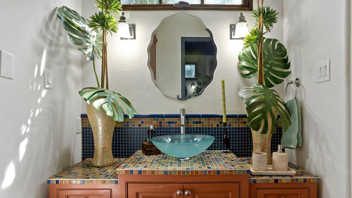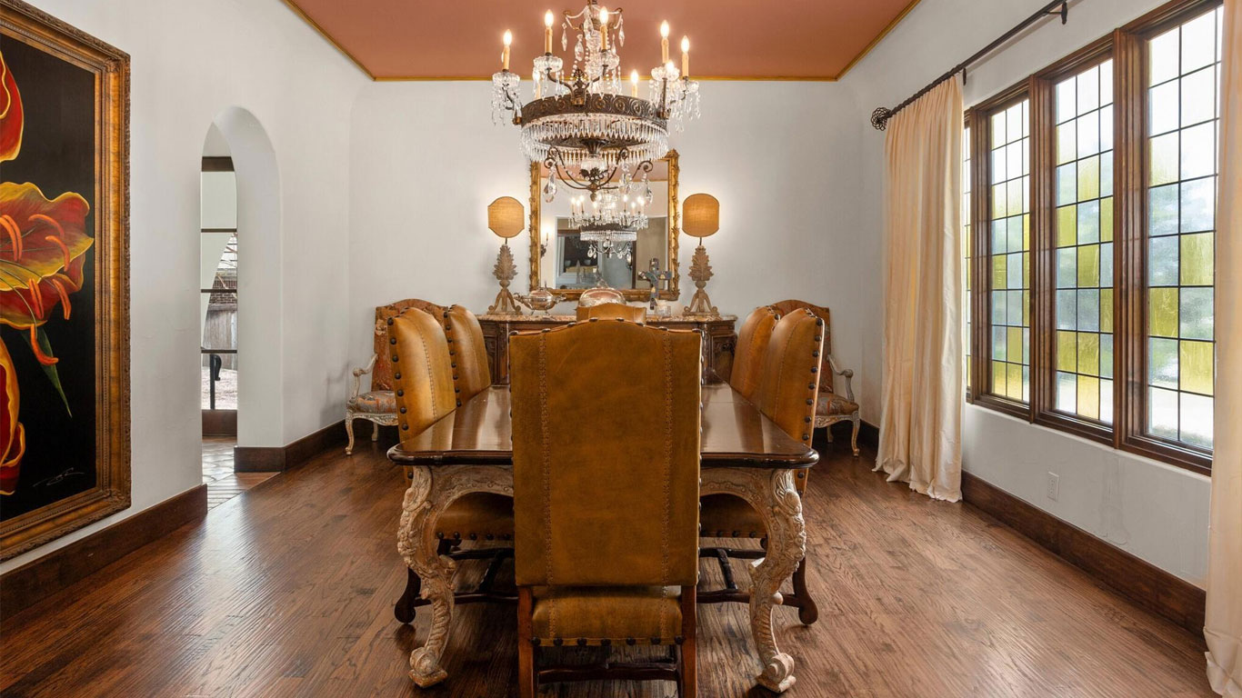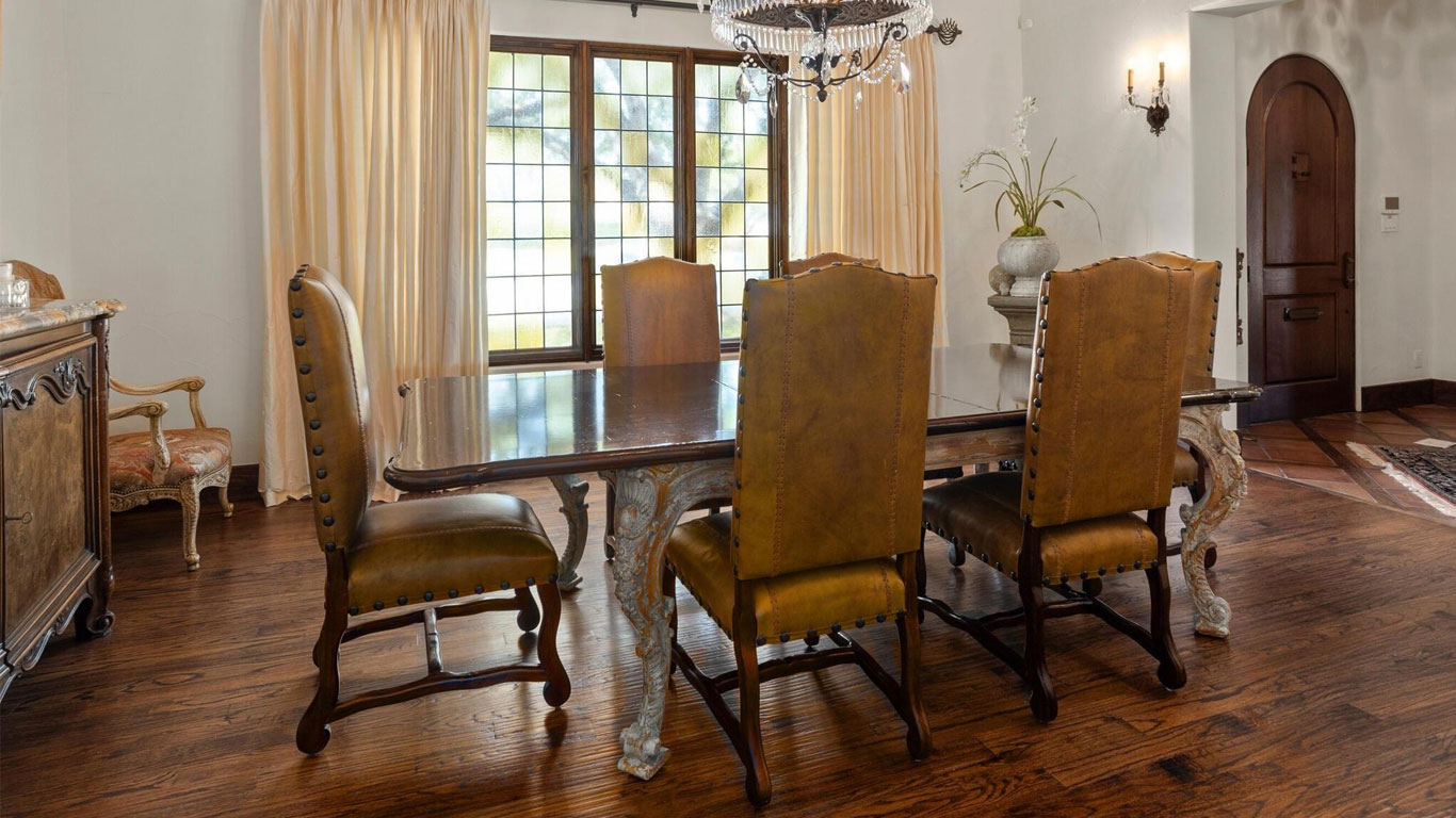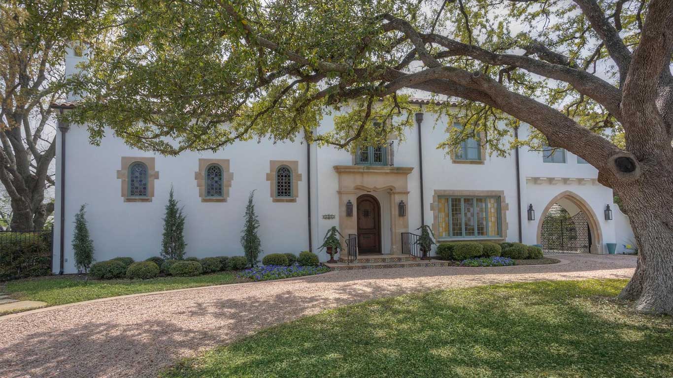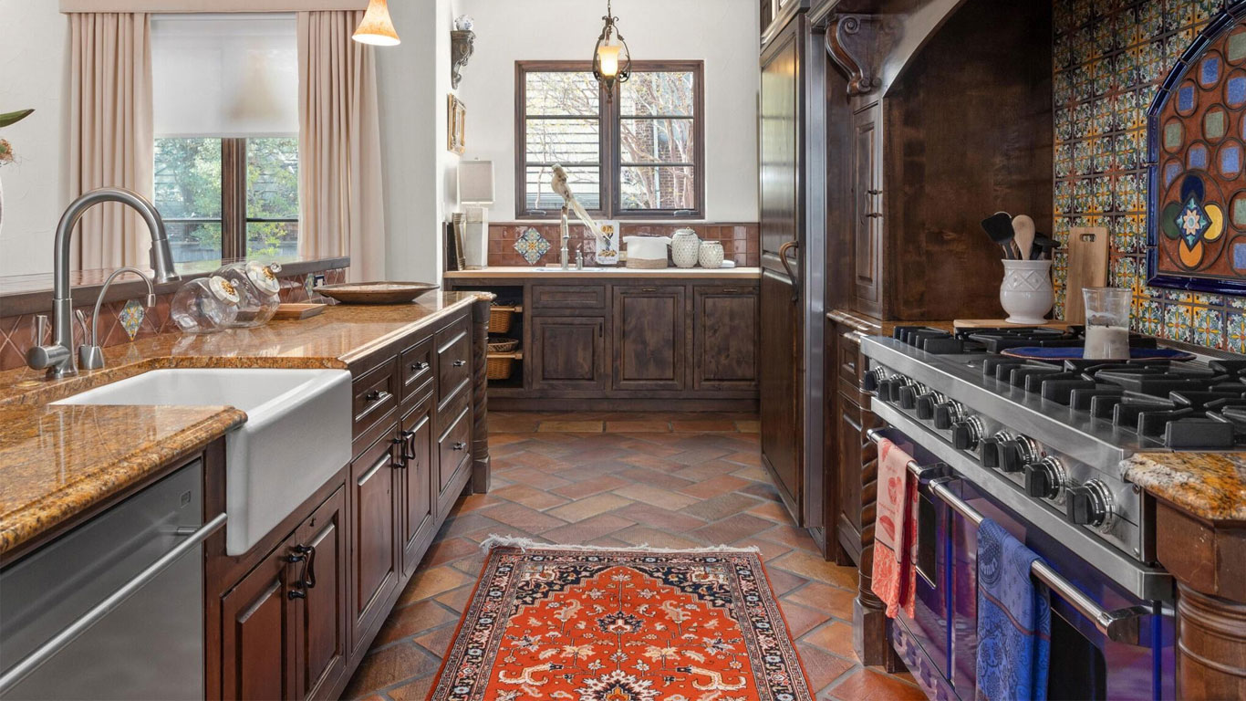 This elegant Spanish-style Westside home features 4 bedrooms, 4.5 baths, an open layout with tall wood-detailed ceilings, high-end finishes, and a sunroom overlooking a serene garden patio with a stucco fireplace.