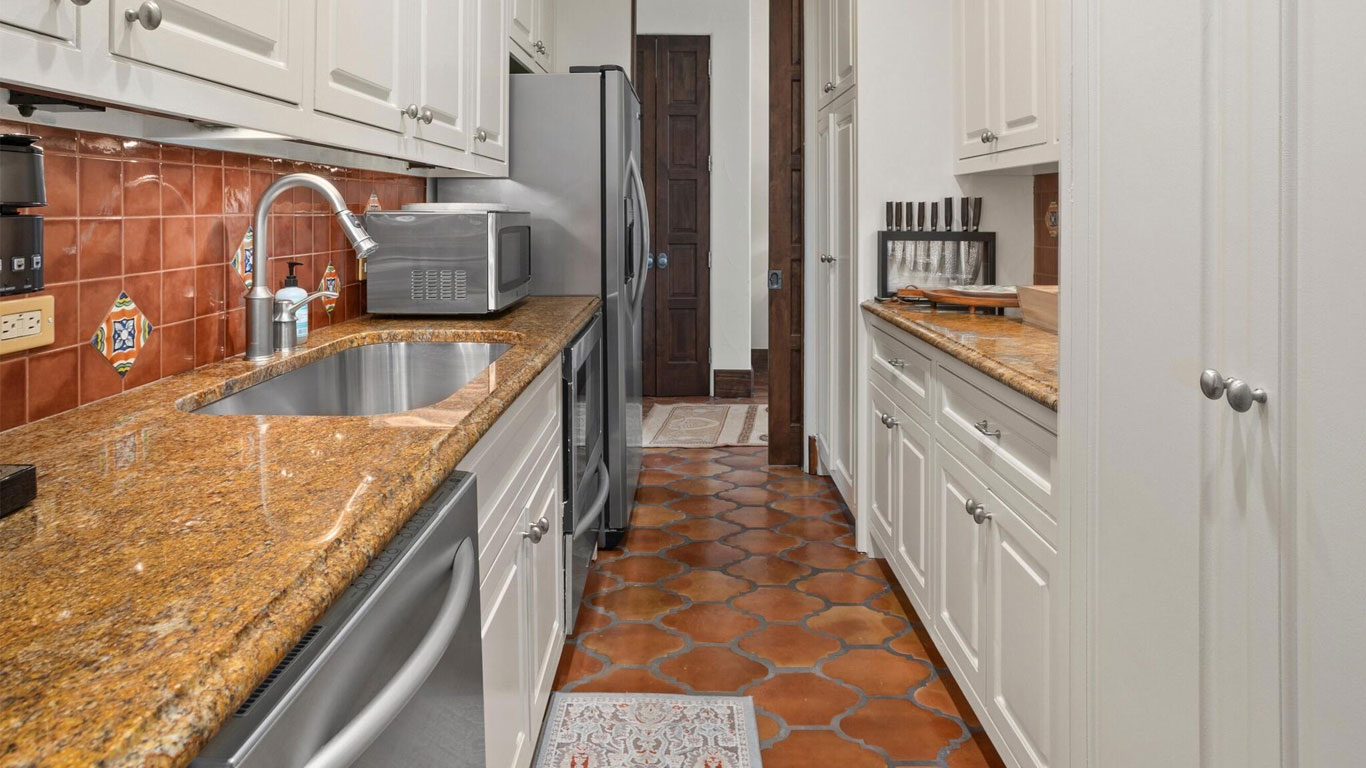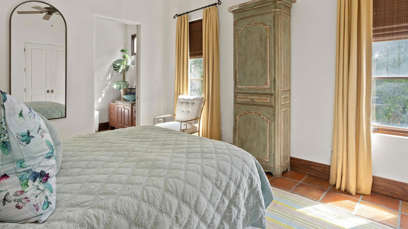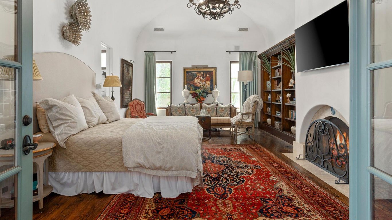 This stunning Spanish-style Westside home offers 4 bedrooms and 4.5 baths, featuring an open layout with tall, wood-detailed ceilings, high-end finishes, and beautiful tile and woodwork throughout. The main level includes a luxurious primary suite and guest suite, while arched doorways lead to a light-filled sunroom overlooking a serene garden patio with a large stucco fireplace.