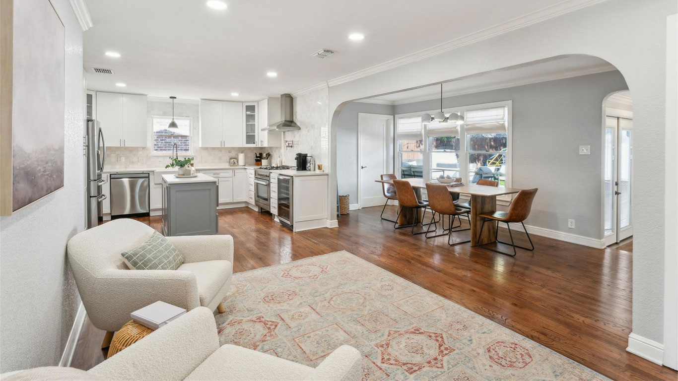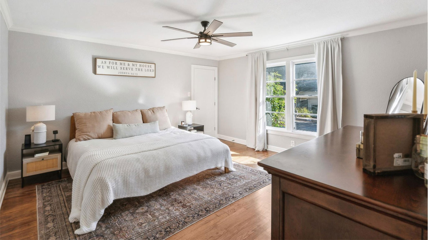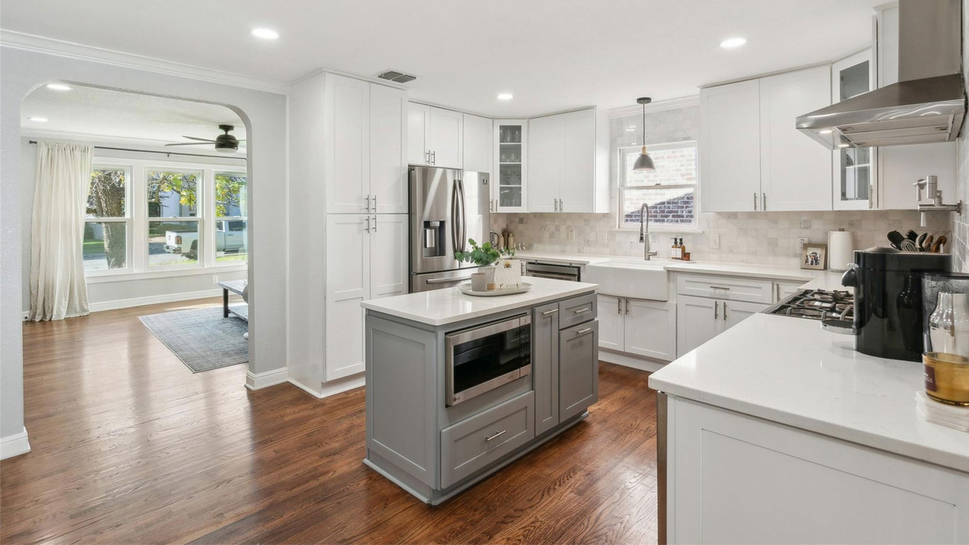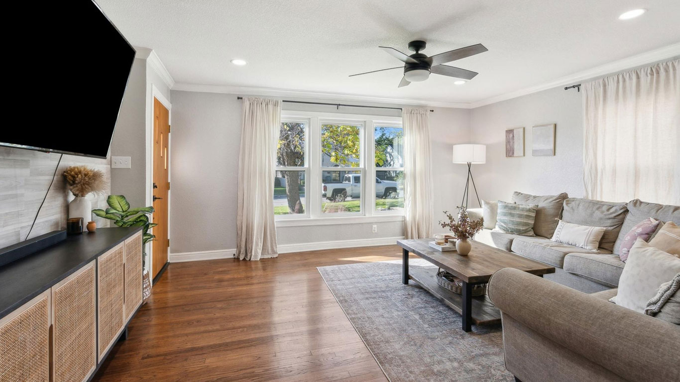 This fully renovated 4-bedroom home offers an open, light-filled layout with hardwood floors and a custom quartz kitchen, plus a spacious primary suite, TREX deck, and new oversized 2-car garage—all just steps from Roy Pope Grocery and Sanguinet Park.