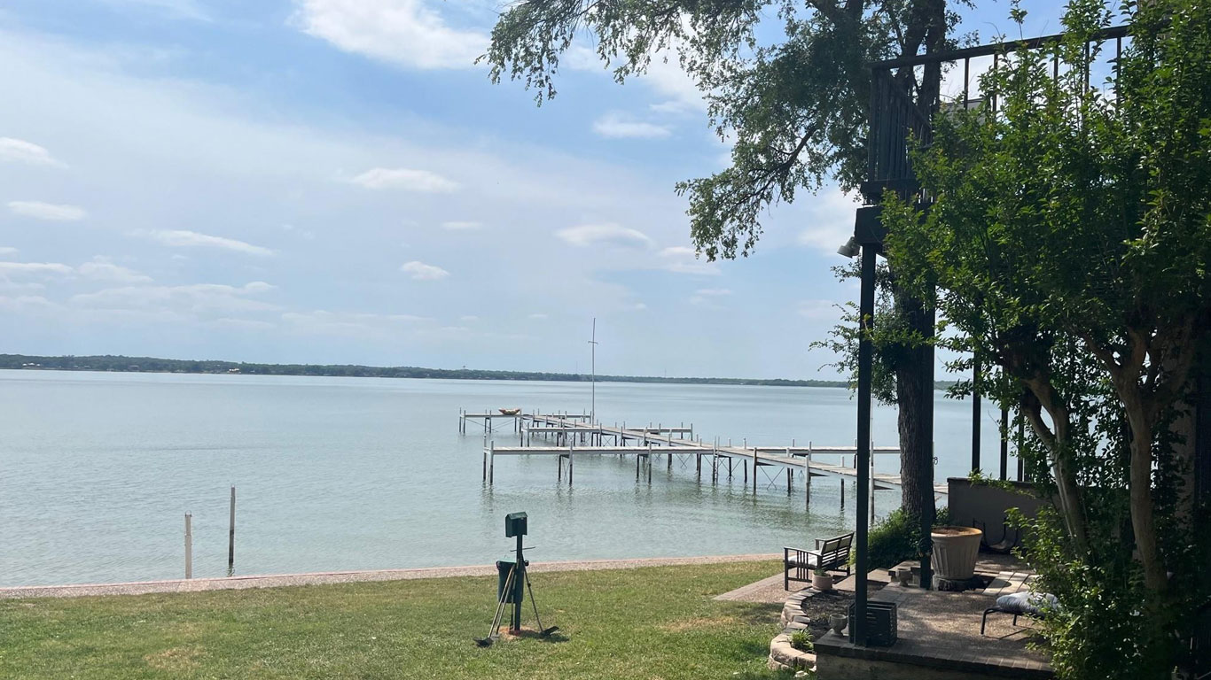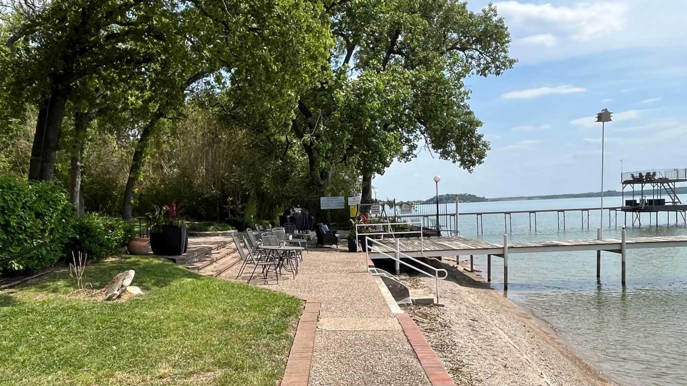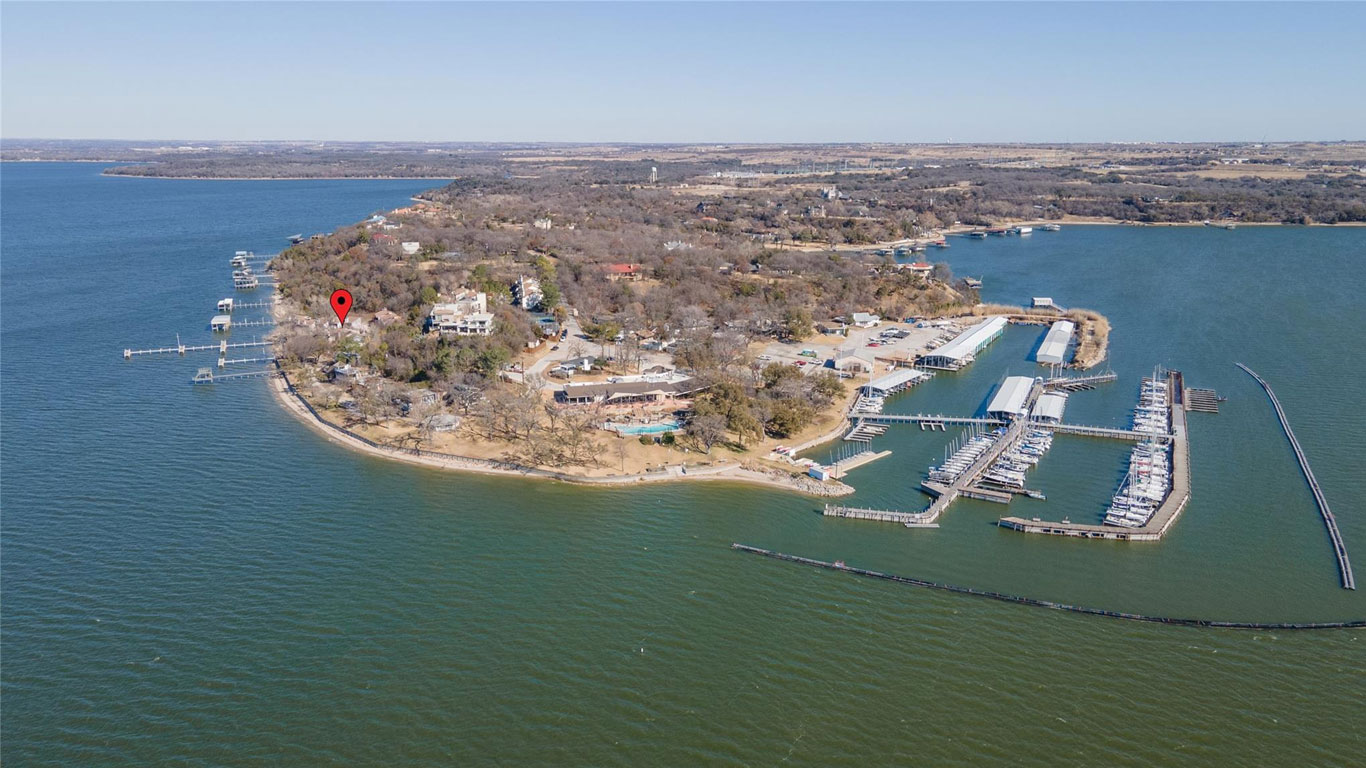 Aerial view of a lakeside neighborhood with a large body of water. Houses and trees line the shore. A red location pin marks one property near the lake. Tennis courts are visible to the left.