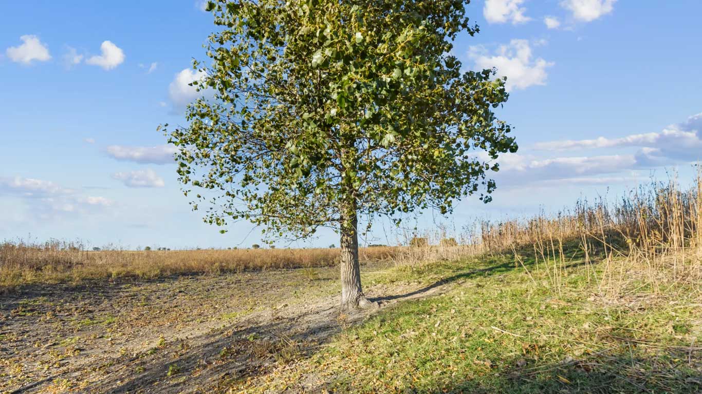 A small pond surrounded by green trees sits in the middle of a dry, grassy field. In the distance, there are scattered buildings, cattle, and open farmland under a partly cloudy sky.